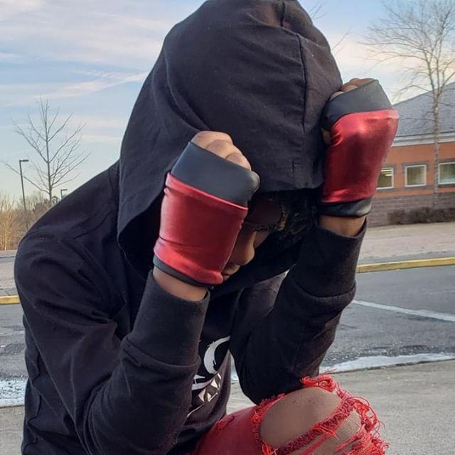 Red metallic fingerless gloves with black leather cuffs for boys,girls and Adults.