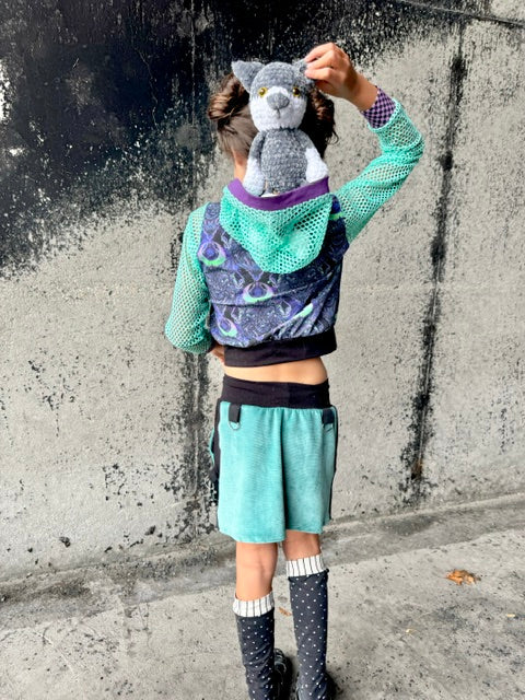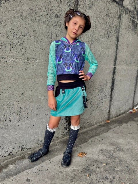 Soft corduroy aqua skirt with pockets. Punky clip on suspender strap add that rebel touch. Also available in BLACK Corduroy fabric . It has washed up great on cold water and dry as usual. It as been prewashed to minimize shrinkage.