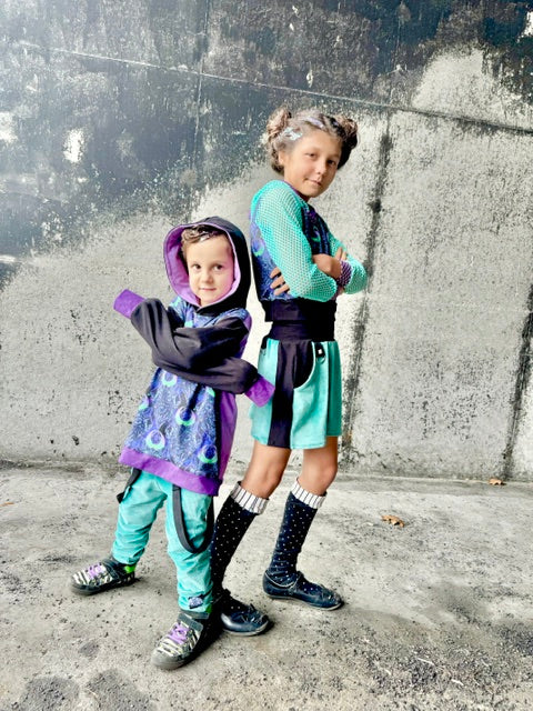 Our exclusive SPW Anniversary Print Hoodie in Aqua and black makes a fun hoodie. Choice of Aqua or Purple or Black sleeves can be two lengths. Attached hoodie is lined. I can switch up the COLORS