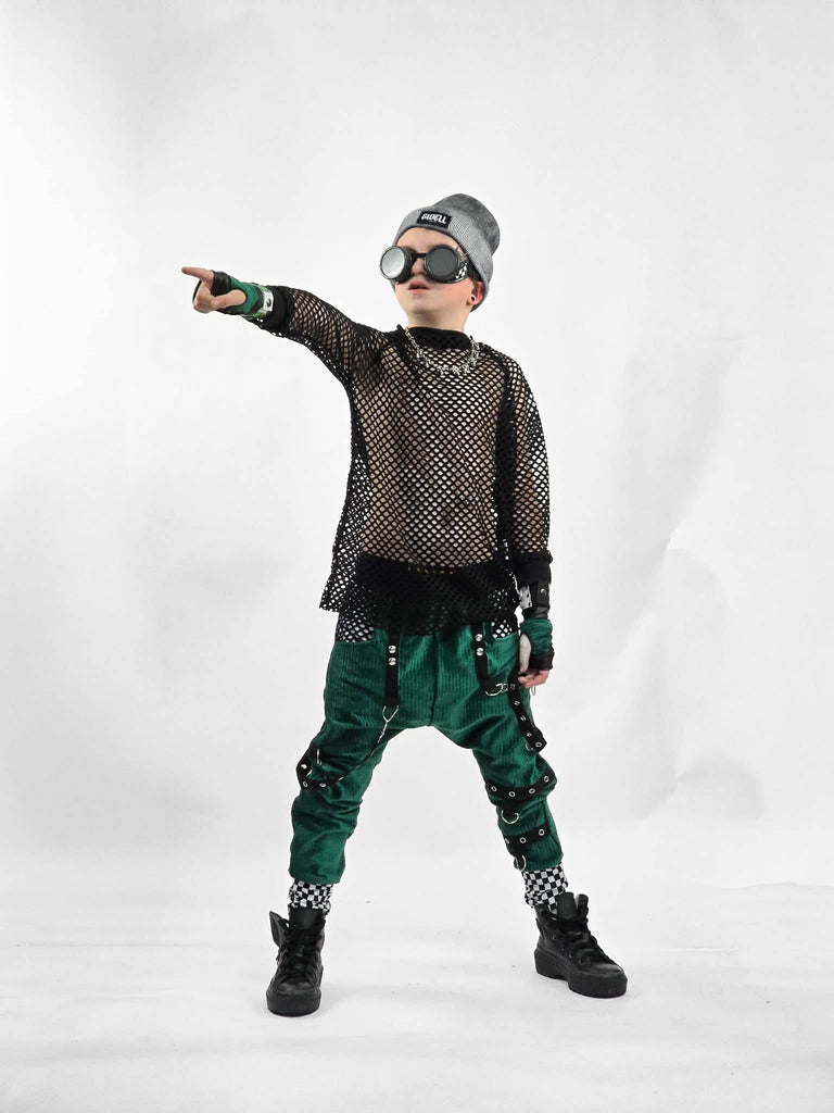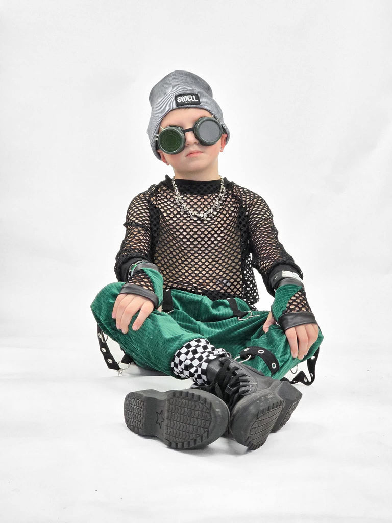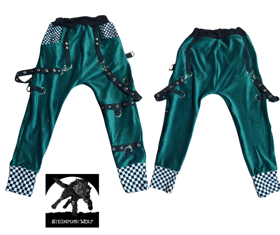 Soft corduroy spruce green jogger pants for unisex kids with big pockets. Lots of extra punk details with grommets,trim, metal rings and studs. Punky clip on suspender strap add that rebel touch. Legs are banded in wide checked cuffs.