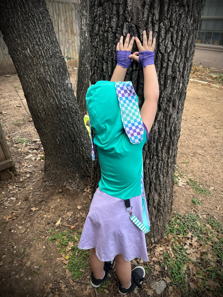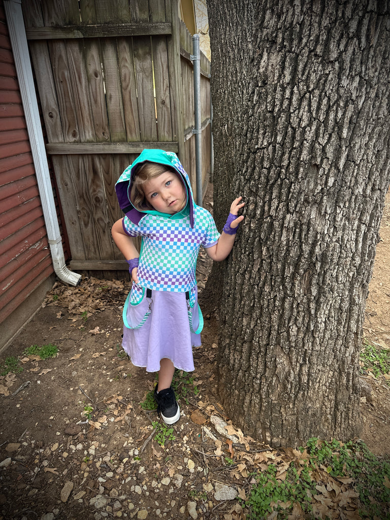 Twirly skirt, bunny ears and pockets make this dress special. Fabric is cotton.
