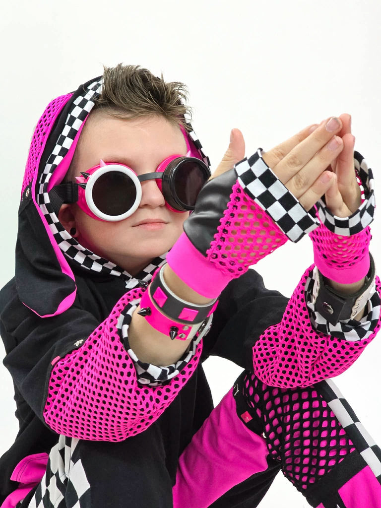 Kids and Adults fingerless gloves with black mesh and checkered cuffs..