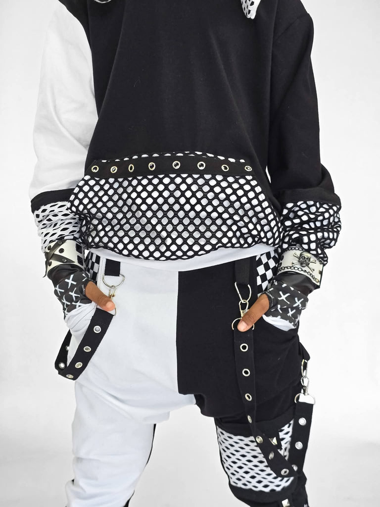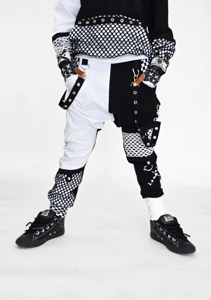 Monochrome Jogger Pants for boys and girls black mesh with checkered accents suspender strap