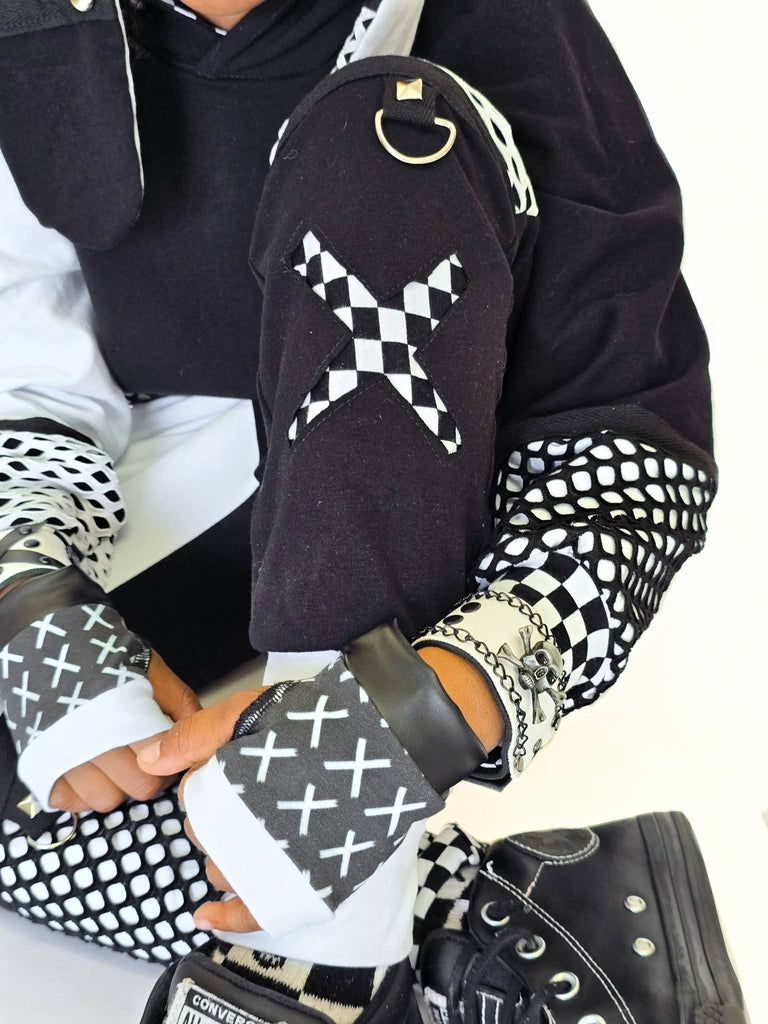Streetstyle monochrome pants add sass to your kids wardrobe. Black and white cotton fabric with roomie fit. Big checkered X applique on knee. Clip on strap and lots of metal rings for chains and more! Big pockets lined in checkerboard and lined pockets.