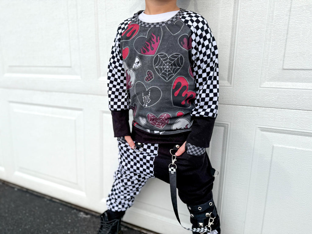 Child's Valentine Heart raglan shirt with heart print with checkered sleeve accents. Banded bottom to keep the shirt in place.